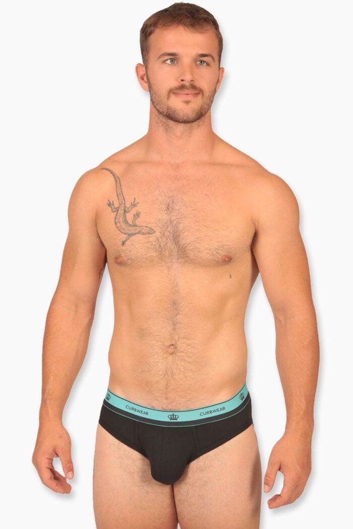 Underwear fit for a King.??Black briefs with a Crown detailed waistband in aqua.